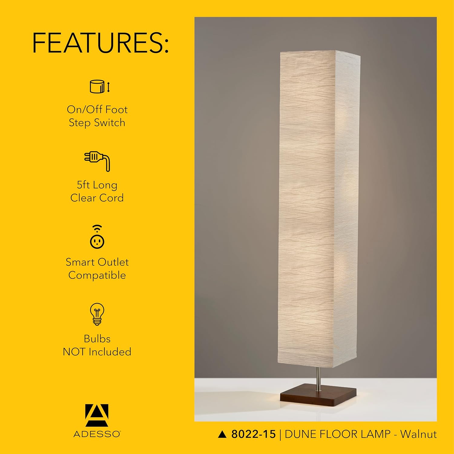 - Dimmable Mood Lighting - Create a warm, cozy atmosphere with Adesso's contemporary floor lamps. The on/off foot switch lets you choose between lighting 1, 2, or all 3 bulbs making this dimmable floor lamp adaptable to all your needs.