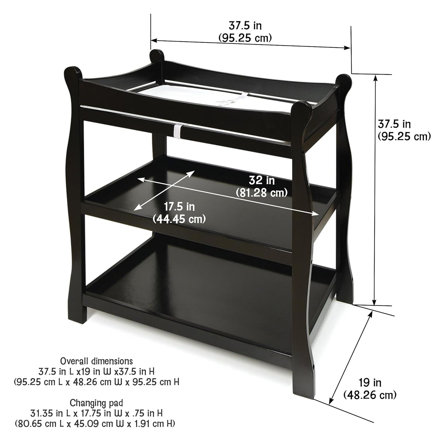 Badger Basket Sleigh Style Baby Changing Table - Nursery Diaper Station with Safety Rails, Foam Pad, and Two Storage Shelves - Nursery Organizer - Black