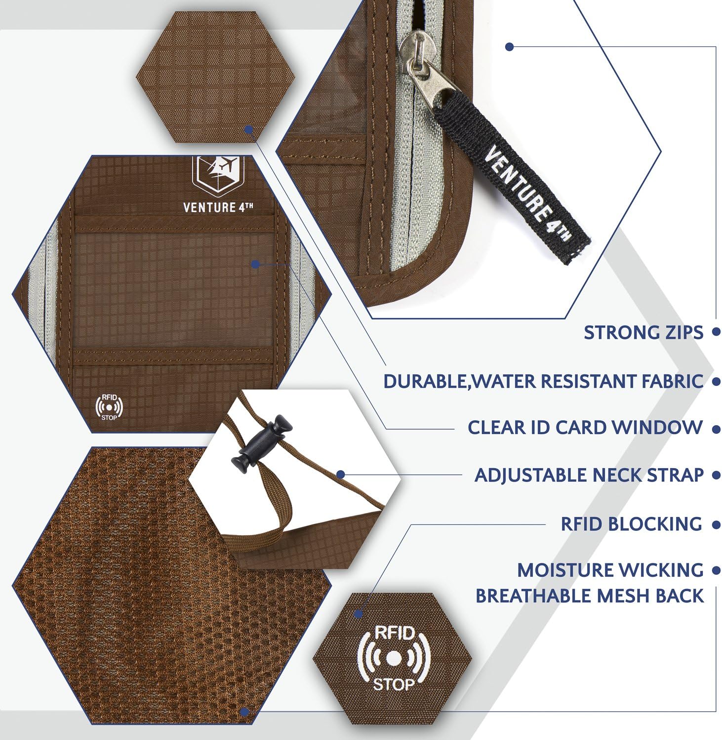 VENTURE 4TH Passport Holder Neck Wallet with RFID Blocking Nylon Lining - Hidden Neck Pouch for Travel (Brown)