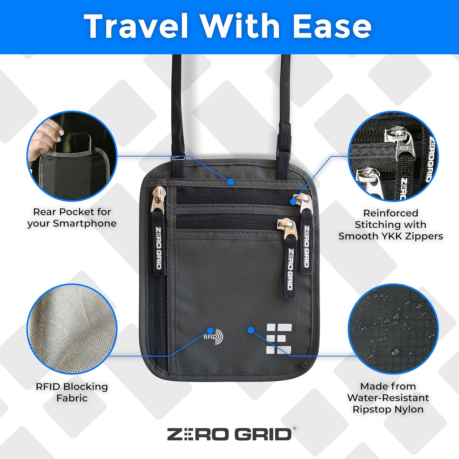 Neck Wallet for Travel & Passport Holder with RFID Blocking - Slim & Easy to Conceal Nylon Travel Pouch for men & women - Holds Phone, Cash, Cards, Keys - Sweat & Water Resistant - Large - Dark Grey
