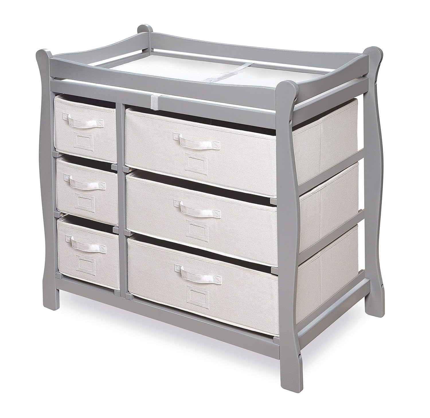 Badger Basket Sleigh Style Baby Changing Table - Diaper Station with 6 Removable Storage Baskets, Safety Rails, Pad, and Belt - Nursery Organizer - Gray/White