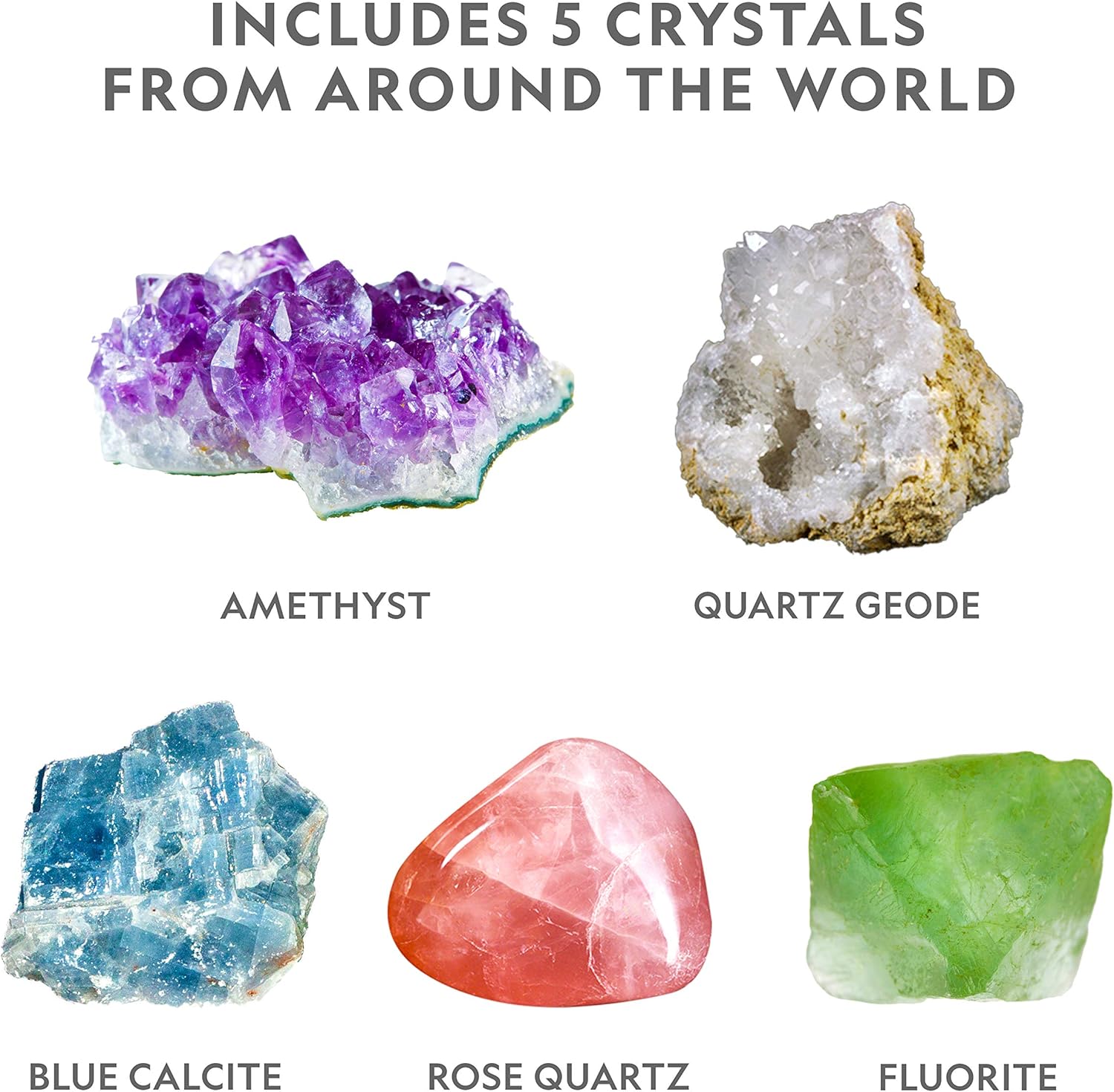 - INCLUDES REAL CRYSTAL SPECIMENS โ Start or expand your rock collection! Comes with 5 real gemstone specimens: quartz, rose quartz, fluorite, calcite, and amethyst. Learn about the gemstones in the kit with the included, full-color Learning Guide.