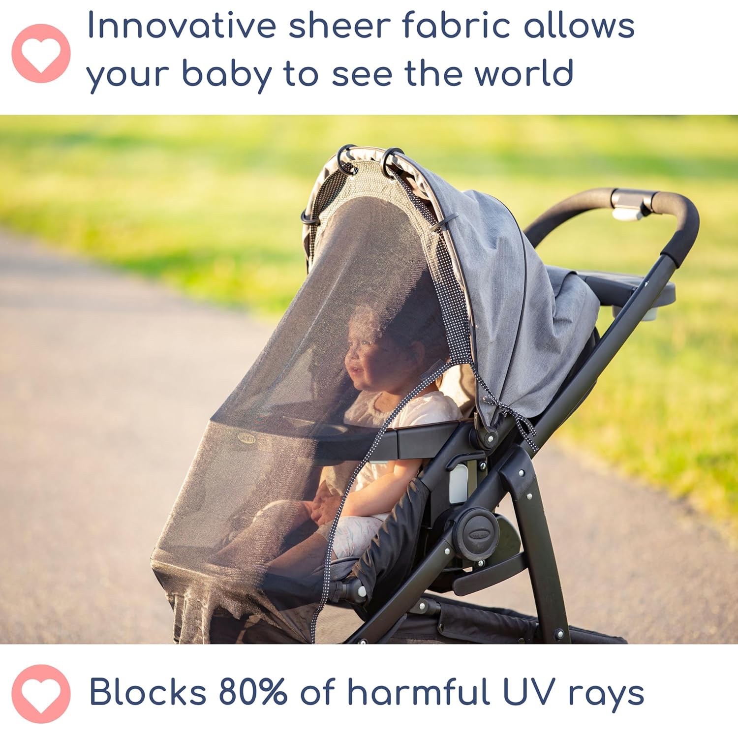 - Sun Protection With No Compromise - Blocks up to 80% of harmful sunrays. The ultimate stroller shade, sun protection for baby stroller, and sun blocker for stroller in one breathable, see-through design.