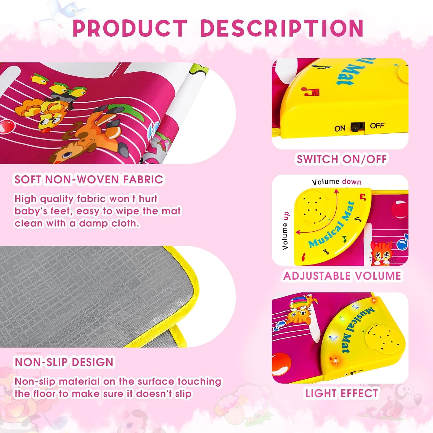 - 【Multifunctional Floor Piano Mat】Kids piano mat with 8 piano keys, 8 animal sounds and the "switch" button to change modes, the rich music helps baby's listening development. Foldable floor piano features clear sound and flashing light, which will stimulate your child's curiosity and allow them to play for hours without getting bored or crying. You can also adjust the volume to suit your child's needs.