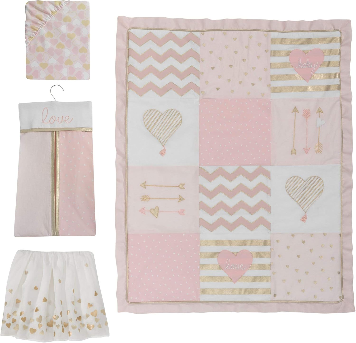- Metallic gold hearts decorating the dust ruffle which has a 14.5โ drop is perfect for any baby girl nursery.