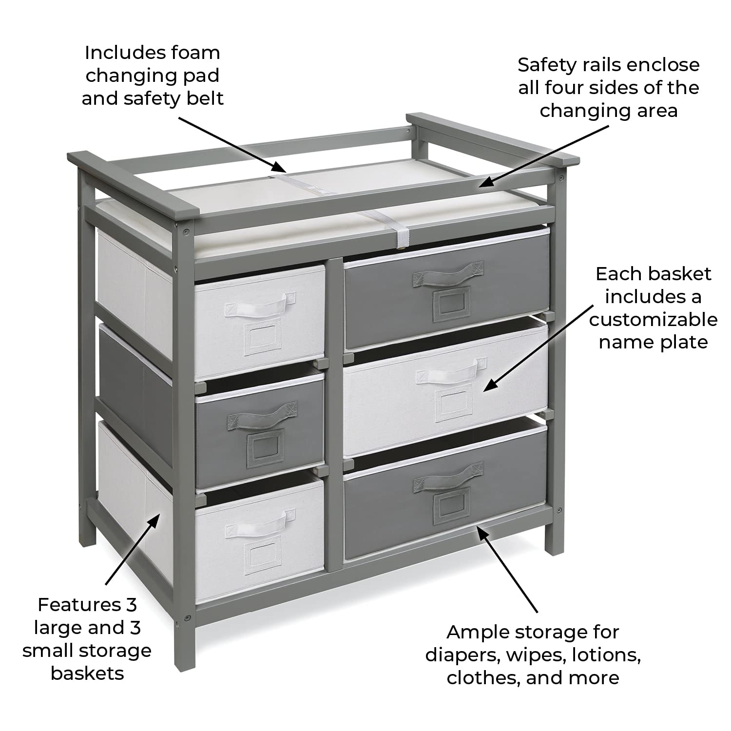 Badger Basket Modern Baby Changing Table - Diaper Station Organizer with 6 Storage Drawers, Reversible Baskets, Safety Rails - Baby Nursery Furniture with Changing Pad and Belt - Gray