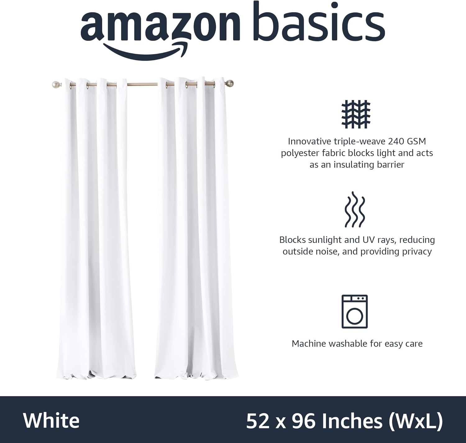 Amazon Basics Room Darkening Light Blocking Blackout Window Curtain with 2 Panels Grommets, for Living Room and Bedroom, 52 x 96 inches, White - Set of 2