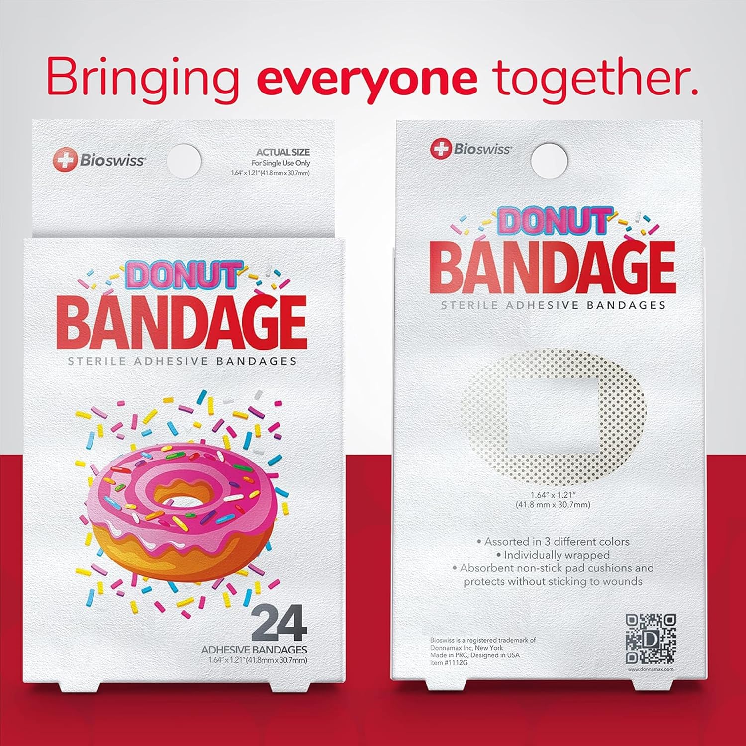 - DONUT BANDAGES: This 24 piece pack of adorable and delicious looking doughnut bandages is great for putting a smile on kids' faces while protecting wounds such as cuts, scrapes, and burns, and come in 3 assorted colors; sticky bandages are perfect for kids and adults alike, and also for school nurses and pediatric doctors