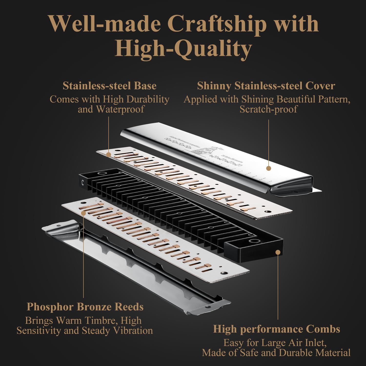 - ♫🎁 ADVANCED MATERIAL – Equipped with phosphor bronze reeds, the harmonica provides high sensitivity, and strong explosive force. The thickened brass base (1.1mm) is durable. The non-toxic ABS combs are waterproof and high in hardness.