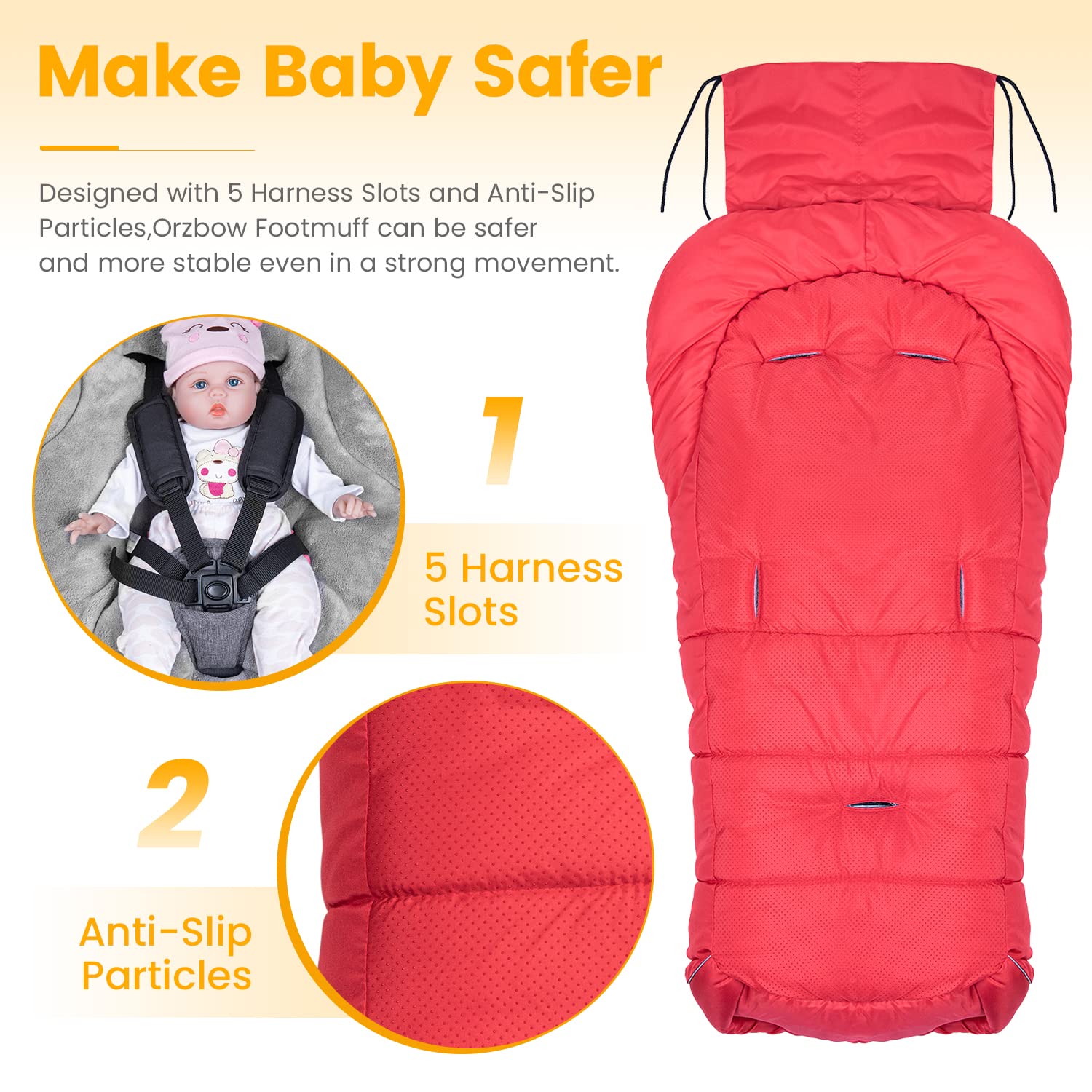 - Adjustable Fit & Anti-Slip: Orzbow toddler stroller footmuff attaches to most strollers via hook-loop slots; Reflective strips aid low-light use; Non-slip backing with textured particles and top panel tie-downs secure positioning on strollers
