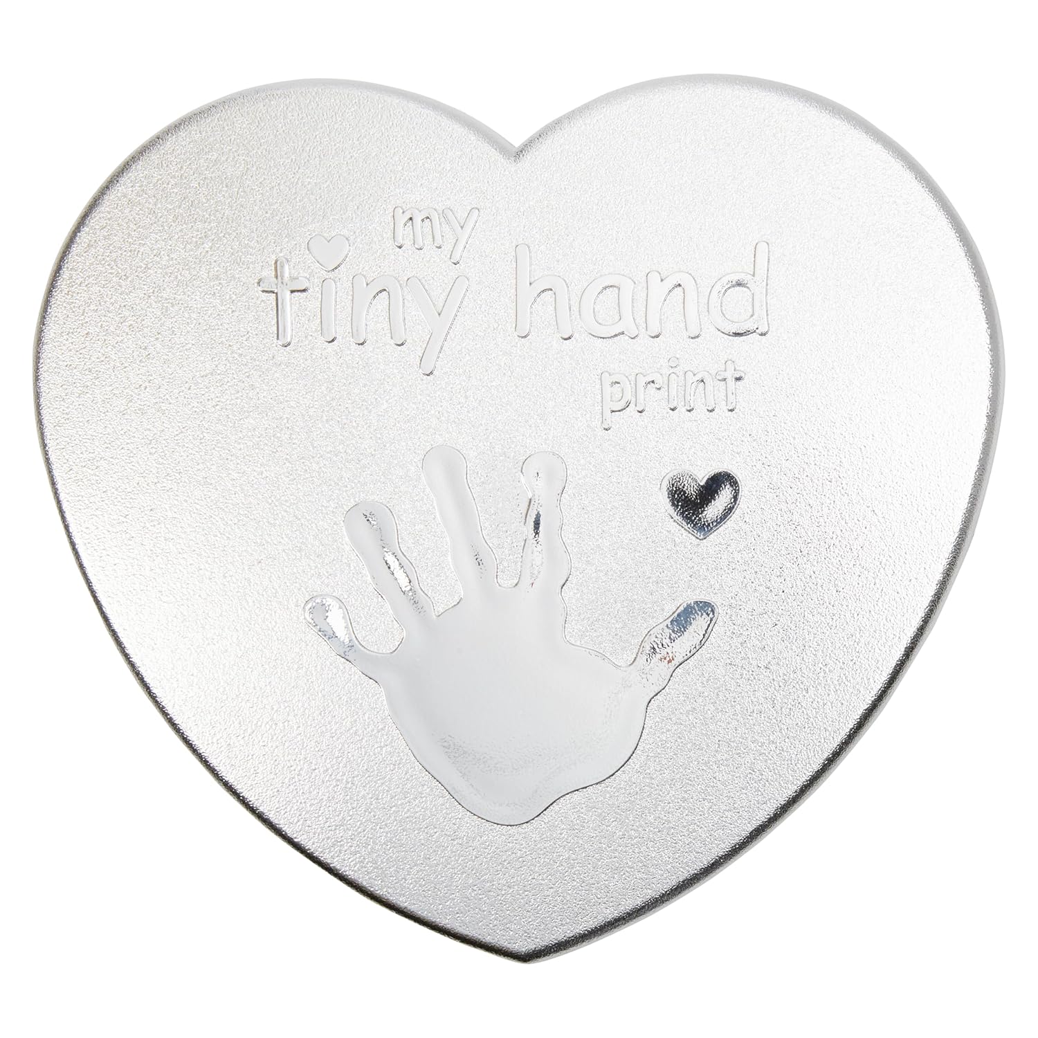 - Baby hand and footprint mold packaged in a darling plastic heart container that reads "My Tiny Hand Print" and measures 6.5" W x 6.25" L.