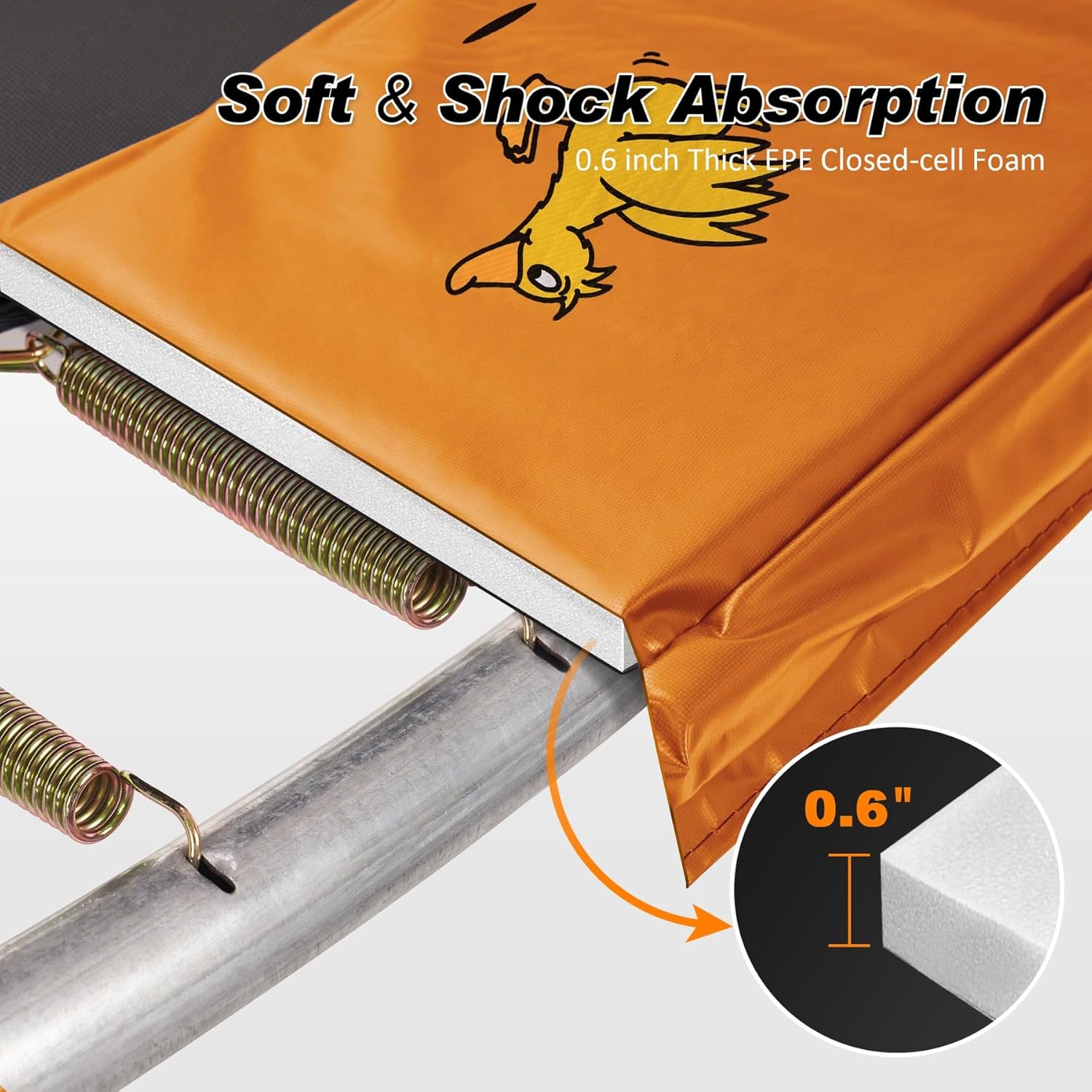 - Foam Padded, Safety & Shock Absorption: 0.6-inch thick EPE closed-cell foam inside, which helps to absorb the impact of a fall, ensuring that you enjoy a safe and sturdy jumping experience. In addition, the spring cover pad also provides you with a cozy resting space