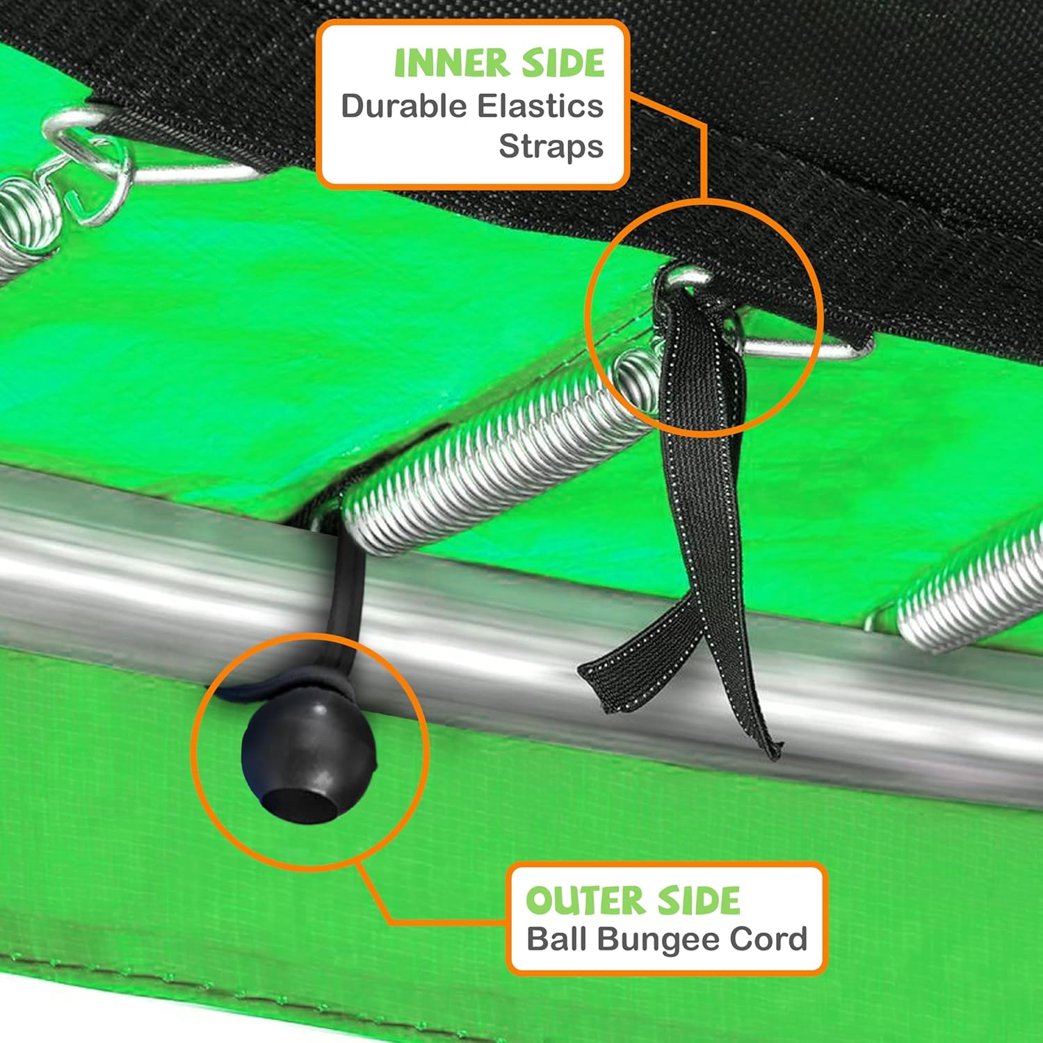 - Specification: Trampoline pad width: 8/10FT: 9.45 inch (24cm), 12FT: 8.66 inch (22cm), 14/15FT: 10.63inch (27cm). Anti-UV/Waterproof/Faded Resistance PVC cover,thick EPE foam(8/10FT: 16mm, 12/14/15FT: 20mm), PE bottom, ultra durable for years to use!
