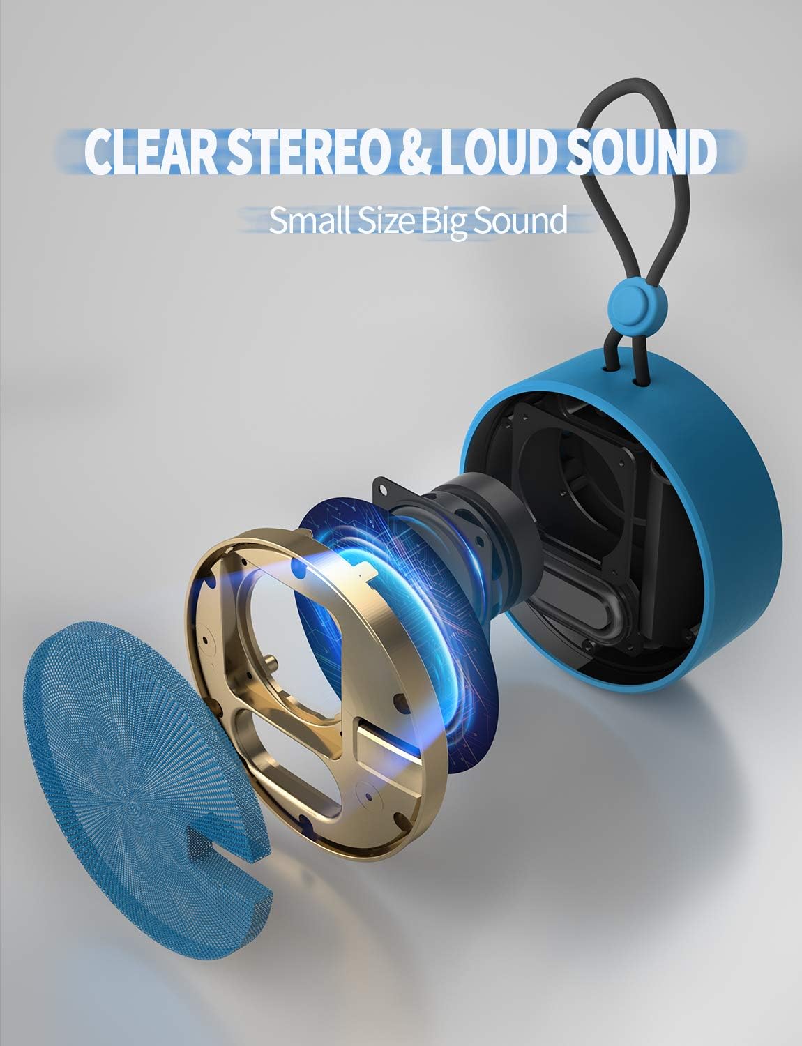 - 【OUTDOOR-READY PORTABLE】 Compact round design packs a mighty punch, and powerful bass sound from an outdoor waterproof speaker so small it fits almost anywhere. Small enough to throw in your beach bag and go! Suit for any listening environment indoors and outdoors, bathroom kitchen, and patio. Built-in microphone for a clear hands-free call, convenience up! Includes the lanyard, a detachable suction cup, and easy to attach shower speaker to bathroom tiles and mirrors.