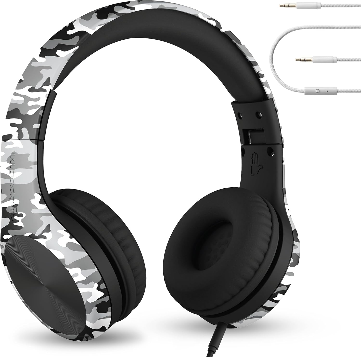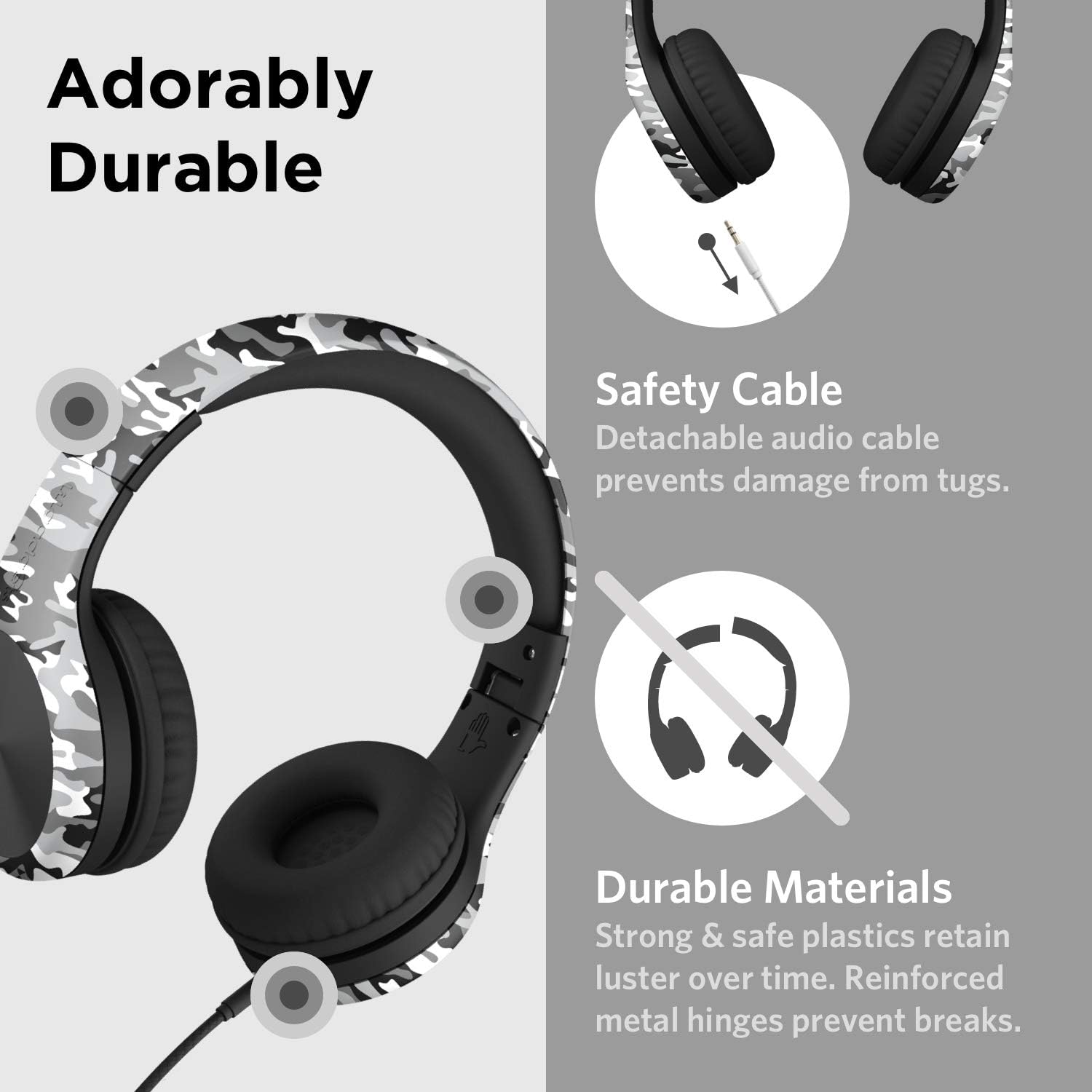 LilGadgets Connect+ Pro Wired Kids Headphones for School w/Microphone, Volume Limiting Noise Reducing Over-Ear Headset w/Cord, SharePort Technology & SoftTouch Padding, Snow Camo Headphones for Kids