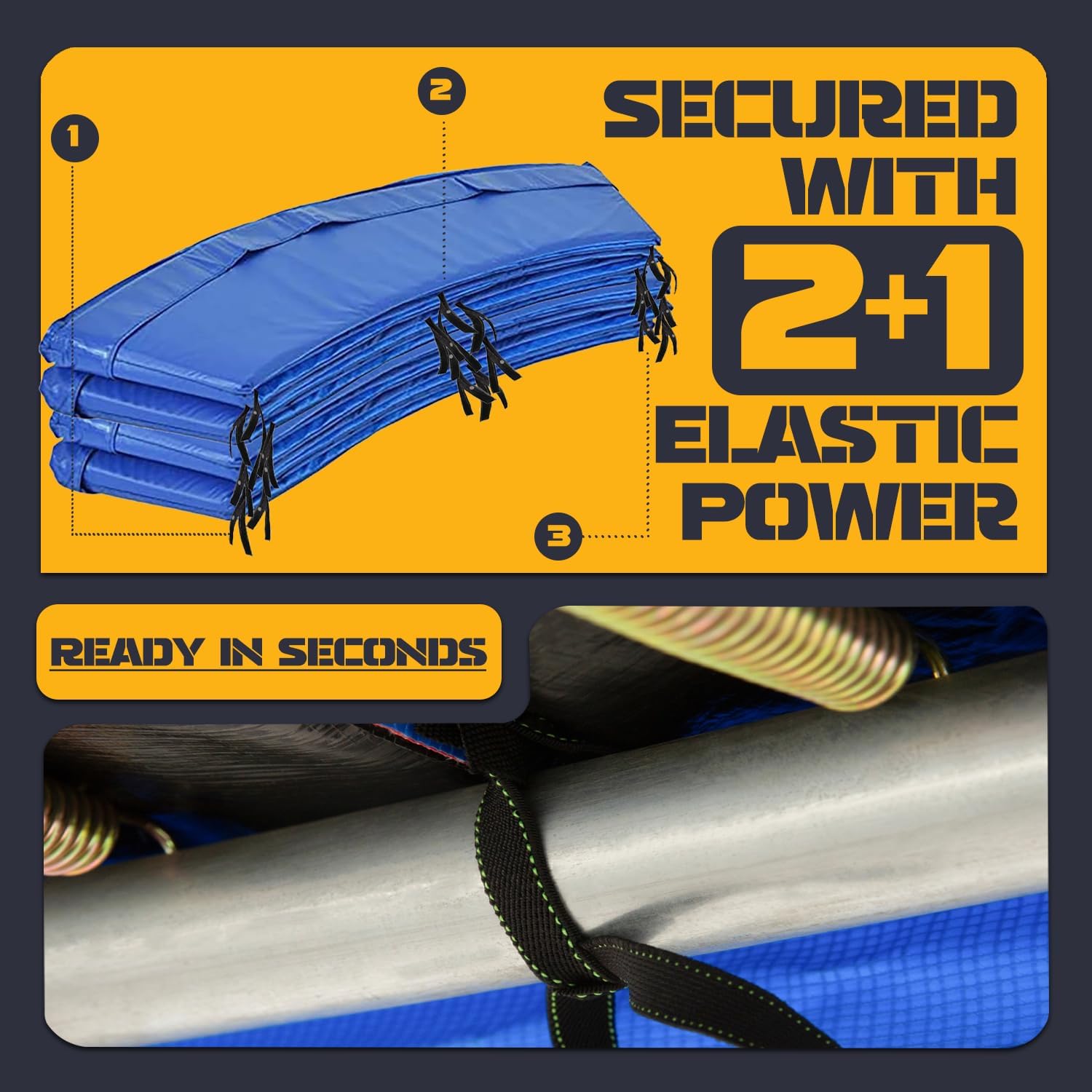 - 👨👩👧👧【270° All-Around Safety Protection】👨👩👧👧At ULTRAPOWER SPORTS, your child's safety comes first! Our trampoline pad replacement is designed to shield kids from exposed springs, preventing injuries while they jump. The extended 270° protective cover wraps around the trampoline frame, offering inside-out protection. Built for durability, it features a 0.55mm thick PVC surface + 0.6-inch protective cotton + an ultra-dense PE bottom, ensuring maximum safety, comfort and fun.