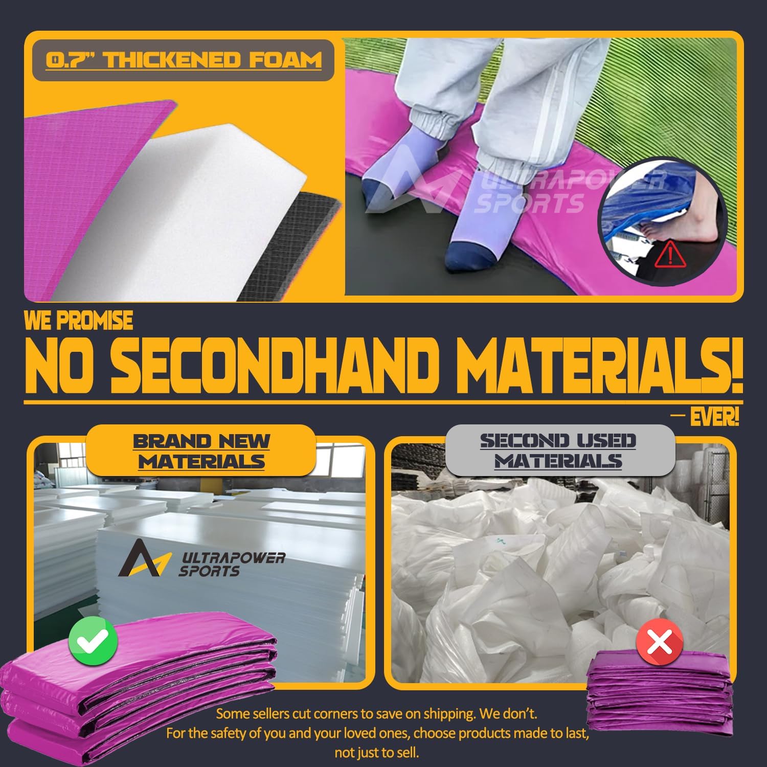 - 🏆️【Trusted Quality ULTRAPOWER SPORTS trampoline pad】 As a top-tier trampoline replacement mat brand, we prioritize safety and durability. We believe that you who appreciate quality will know how to choose wisely. The double industrial-grade stitching and triple-layer construction (PVC + PE + padding) outperform other flimsy covers. Whether replacing worn-out mats or upgrading old trampolines, choose our trampoline pad replacement that balances affordability with professional-grade performance.