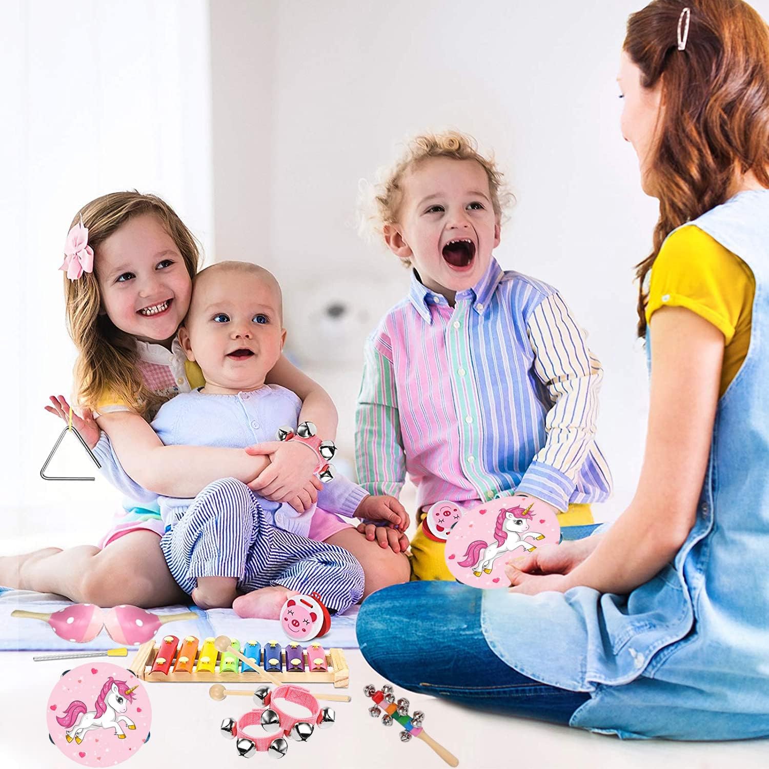 Kids Musical Instruments Sets, 12pcs Wooden Percussion Instruments Toys Tambourine Xylophone for Kids Playing Preschool Education, Early Learning Musical Toys for Boys Girls Gift (Pink)