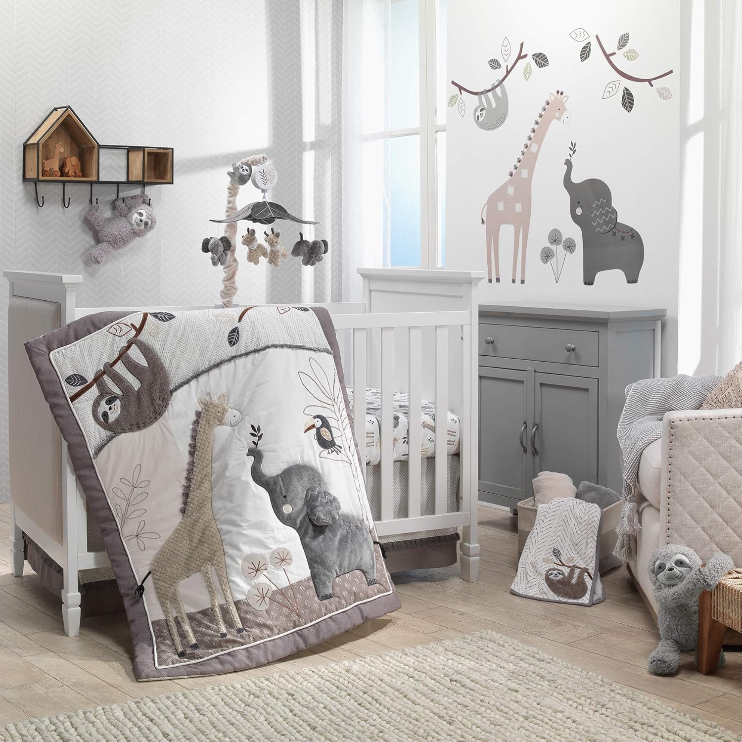 - Comes with quilt, fitted sheet, crib skirt and wall decals for a complete 4-piece jungle-themed crib bedding set