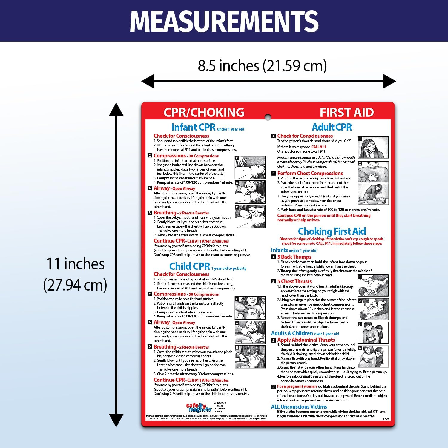 - 2-Pack of Magnetic CPR & Choking First Aid Cards – Each fully laminated card measures 8.5" x 11" and features 4 magnets on the back, allowing you to easily attach them to any metal surface. Made in the USA.