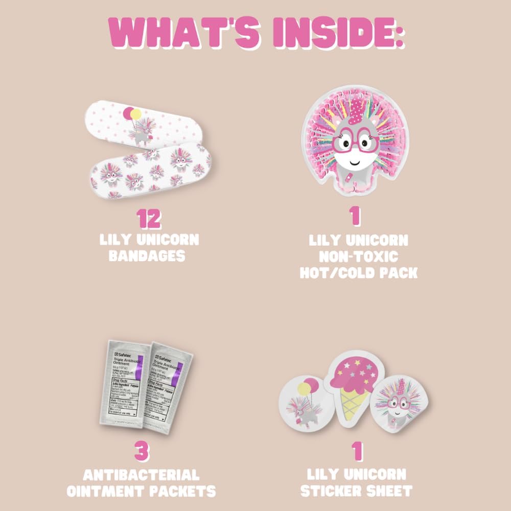 - π¦ΈββοΈ The Set Includes: This kids first-aid kit plush includes 1-character ice pack (for hot & cold use), 12 matching Lily Unicorn bandages, 6 Lily Unicorn stickers, and 3 triple ointment packets. This infant first aid kit is packed in a secret zipper pouch on the stuffyβs back.