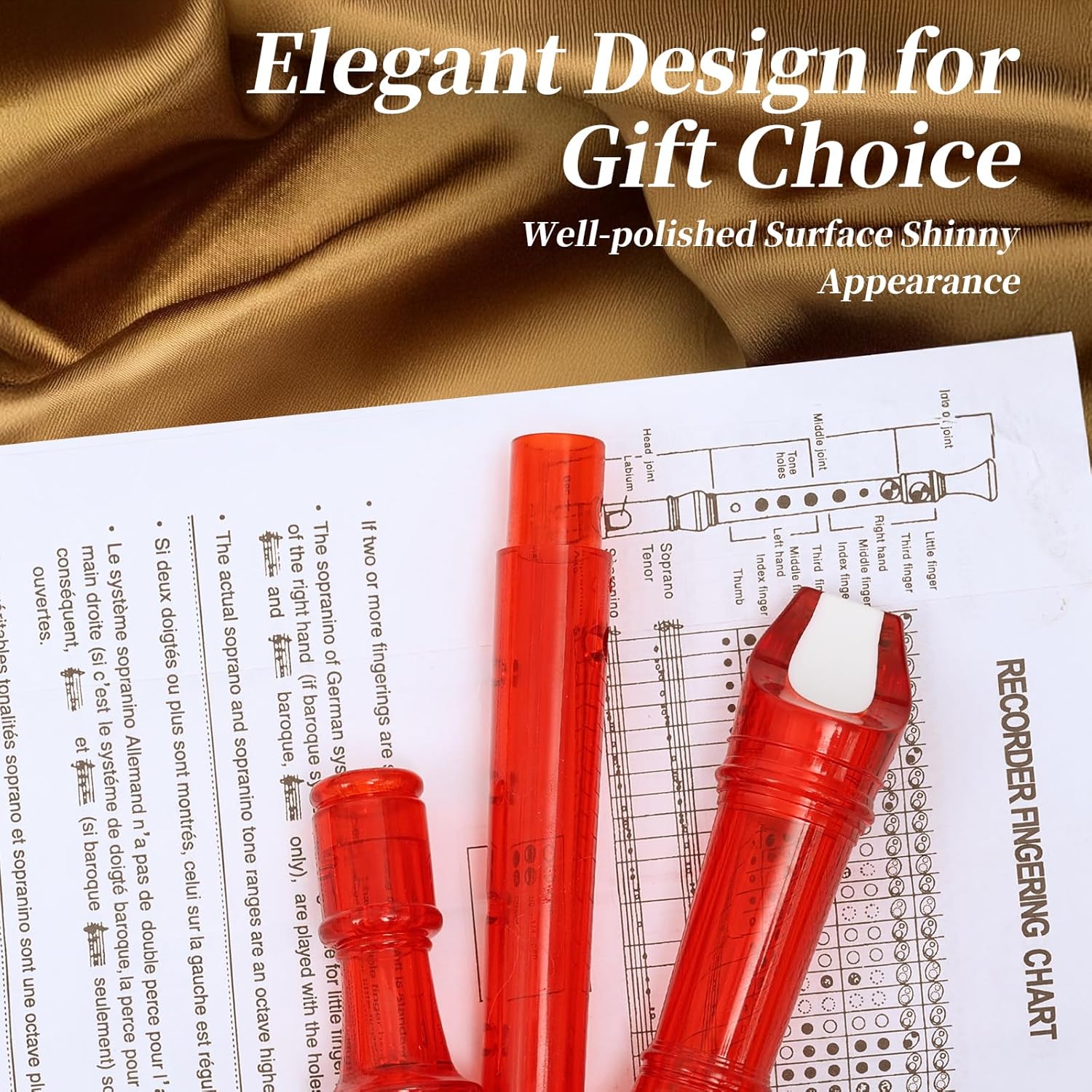- ♫ Package Contents -- Exquisite packing bag,Soprano Recorder,Fingering Chart, Cleaning Rod, Small wipe.Ours recorder is packed in a storage bag,convenient to carry around it, such as music classes, camping trips, road trips, etc.