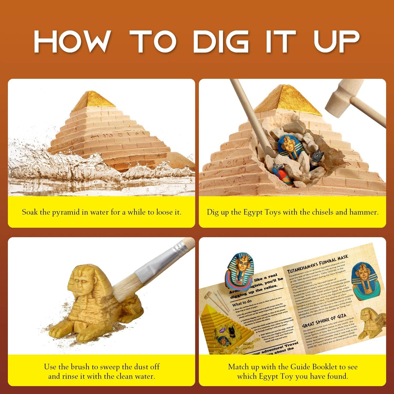 - 💎 Kit Includes: This Giant Pyramid contains 12 Egyptian toys, chisel, hammer, brushe, Includes adventure guide give the young geologists to gain a deeper understanding of ancient Egyptian civilization.