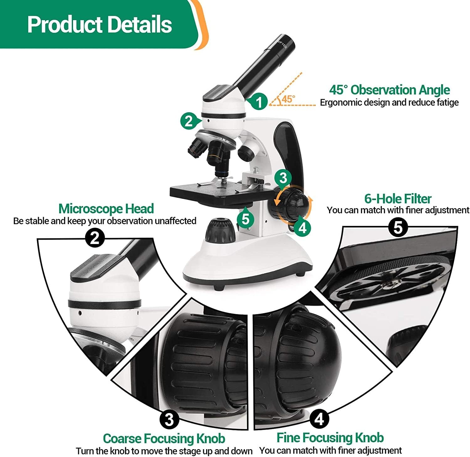 - 【Professional Design & High-Class Material】45°inclined ocular tube with monocular head reduces eye and neck strain, provides a more comprehensive view and enable sharing. Metal base and sturdy handle framework won't make microscope shake