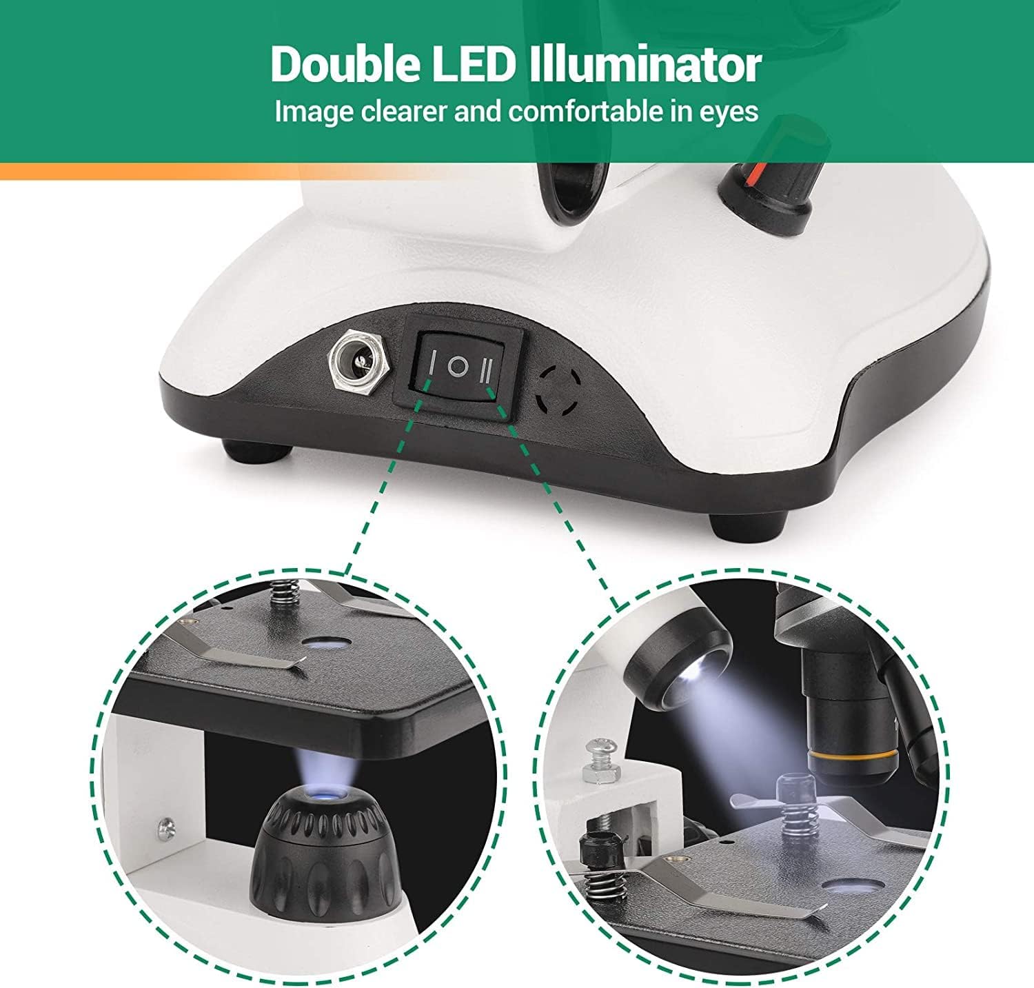 - 【Dual LED Illumination】 The double light compound microscope features both incident and transmitted LED lights, allowing observation of opaque objects from above and translucent specimens from below. The adjustable bottom LED light is easy to use