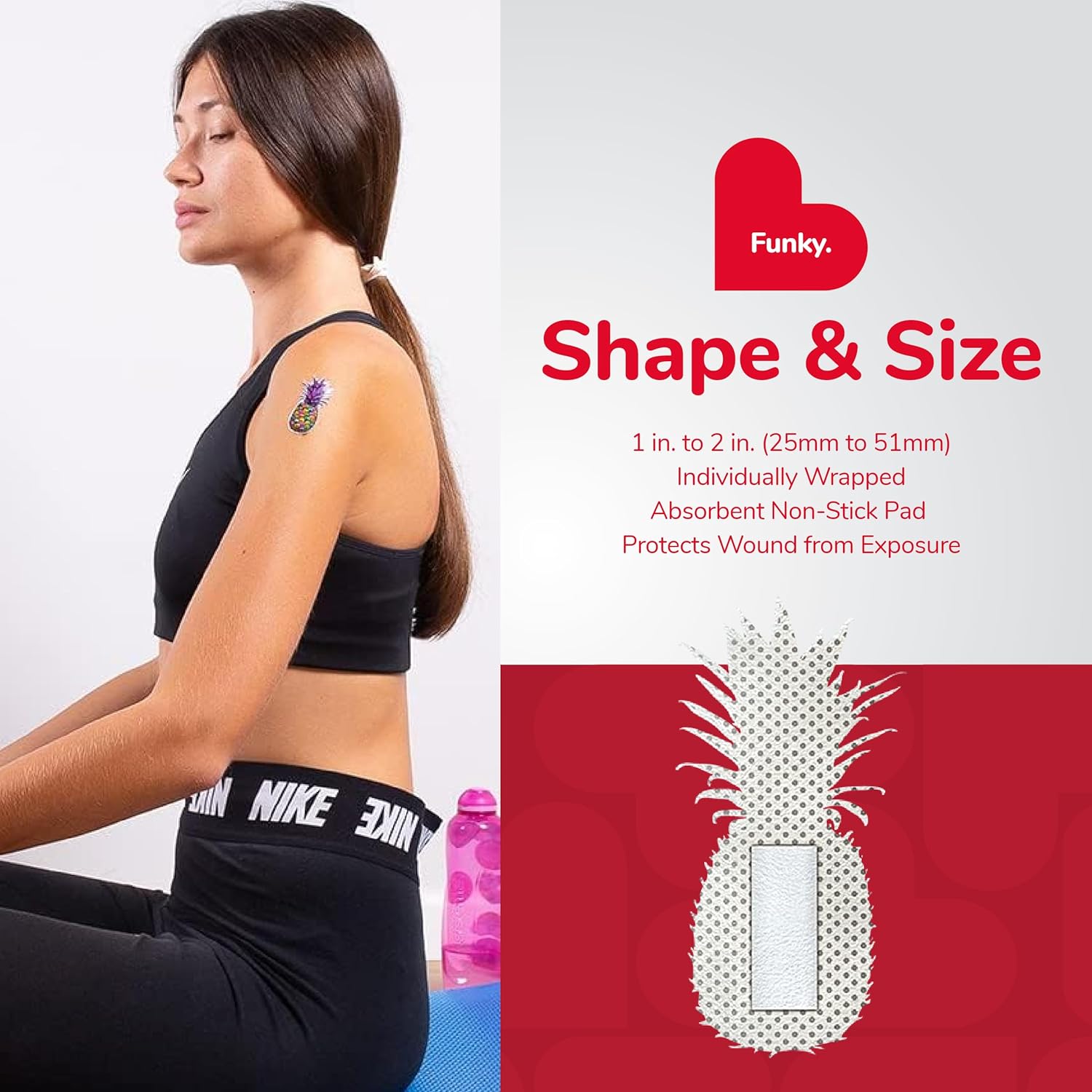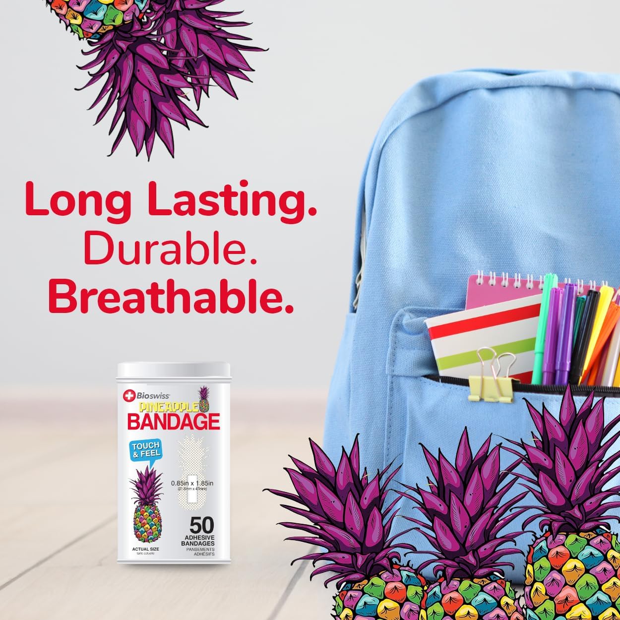 - FUNKY PINEAPPLE BANDAGES: This 50 piece tin of adorable and delicious looking tropical pineapple bandages is great for putting a smile on kids' faces while protecting wounds such as cuts, scrapes, and burns; sticky bandages are perfect for kids and adults alike, and also for school nurses and pediatric doctors
