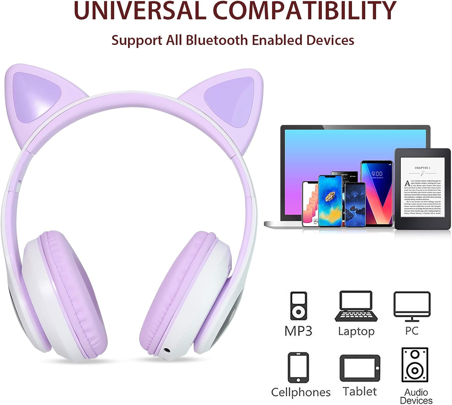 TCJJ Kids Wireless Headphones - Cat Ear LED Light Up, Bluetooth 5.4, Safe Volume Limit, Noise Cancelling with Mic & TF Card for Girls Boys Toddlers School (Purple)