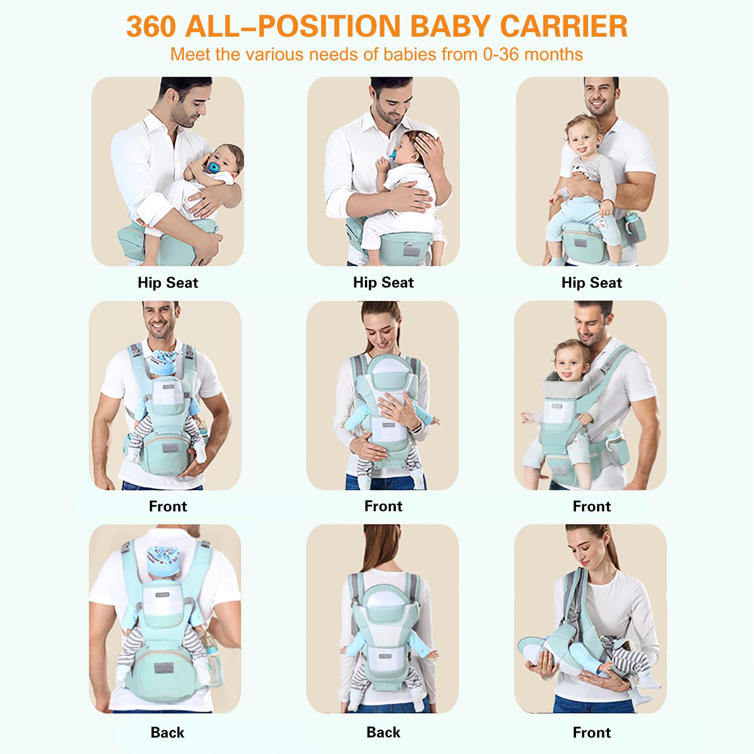 - 6 in 1 Carrying Ways: There are 6 ways to wear the baby carrier from newborn to toddler, parents can choose the most comfortable carrying way according to the baby's growth period. The shoulder straps and hip seat can be used separately. The baby carrier is suitable for babies 0-36 months and weight 7-45 lbs. Parents can use different carrying ways depending on the actual situation.