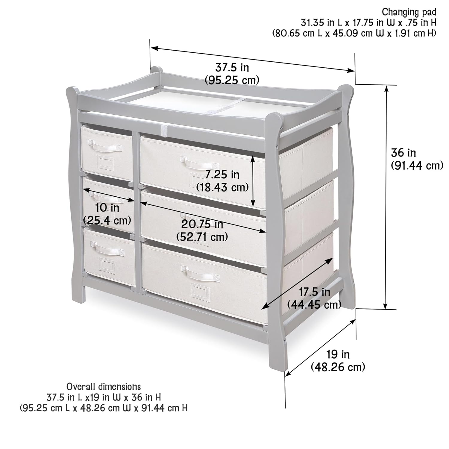 - Ample room for diaper changing on top with six storage baskets in two sizes included below