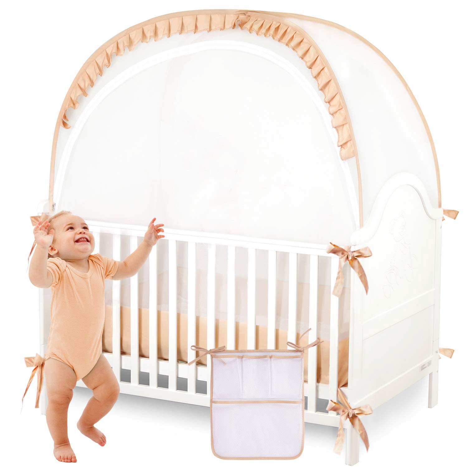 Baby Safety Crib Tent Infant Pop up Mosquito Net Nursery Bed Canopy Netting Cover - Keep Baby from Climbing Out with Hanging Diaper Storage Bag (Beige)