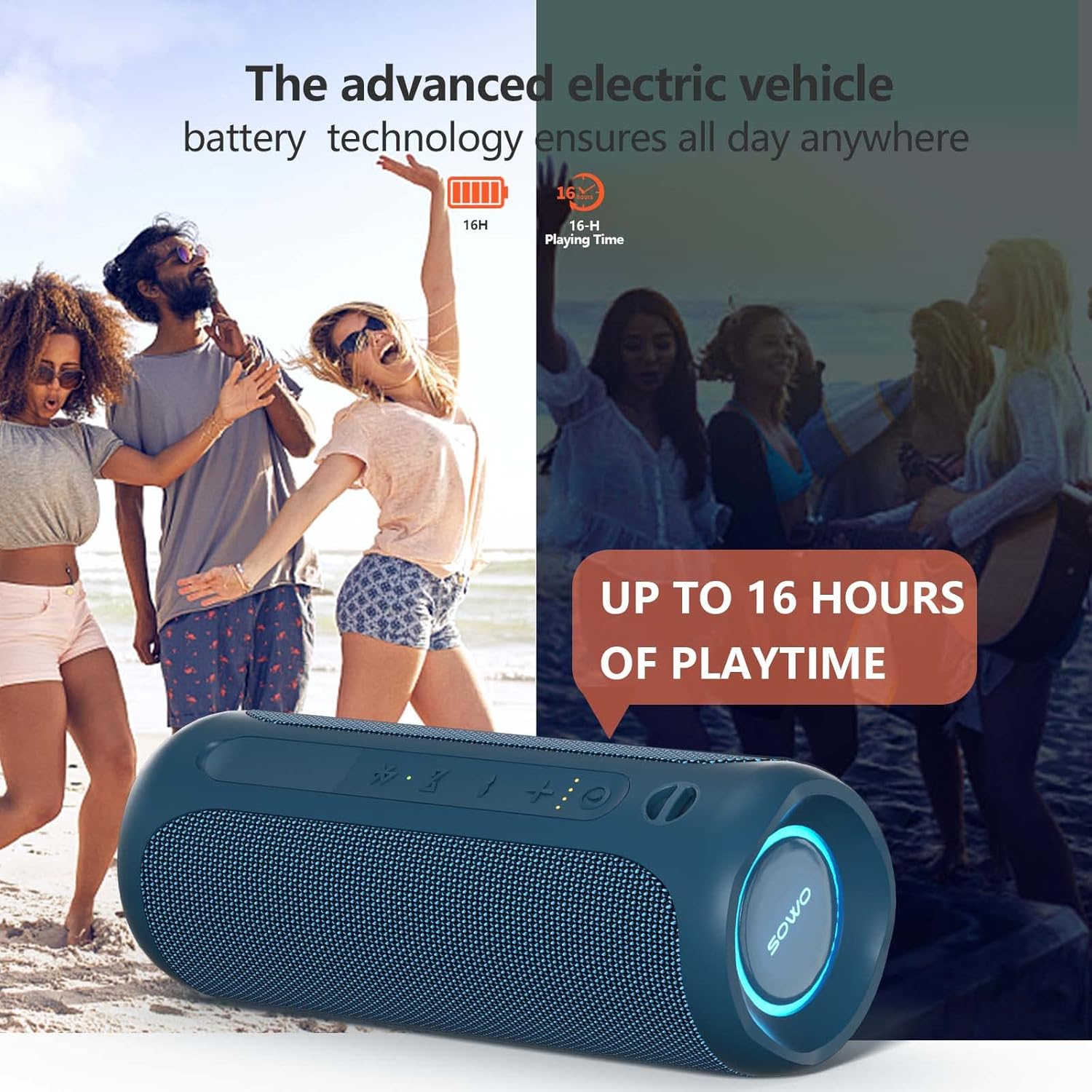 - 16H POWERFUL BATTERY: SOWO Bluetooth speaker portable wireless built with a high power capacity super electric vehicle battery, can be recharged more than thousand times, and has twice the voltage to provide stronger power. Let's enjoy music day to night.