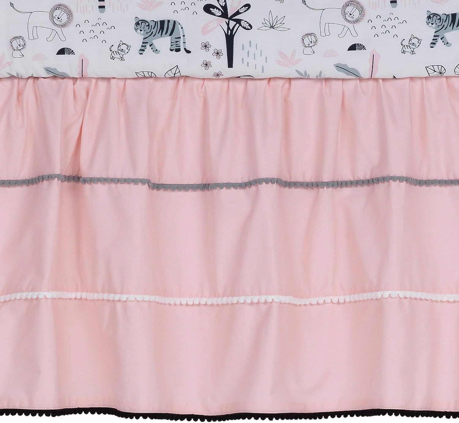 - Pink shirred crib skirt with three rows of colorful pom pom trim