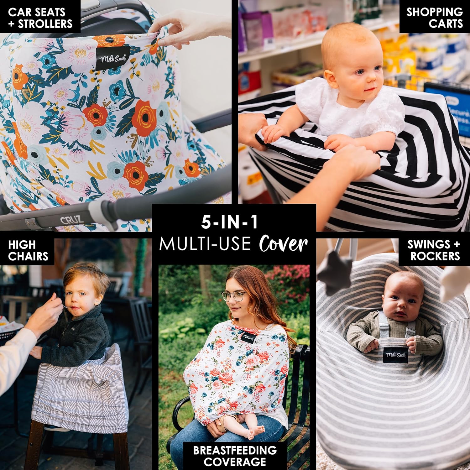 - THE ORIGINAL 5-IN-1 COVER: As seen on ABC’s Shark Tank, our multifunctional all-in-one cover for babies can be used as a infant car seat cover, breastfeeding cover, nursing cover, stroller cover, shopping cart cover, high chair cover, car seat canopy and more! The ultimate baby cover that is fashionable and versatile.