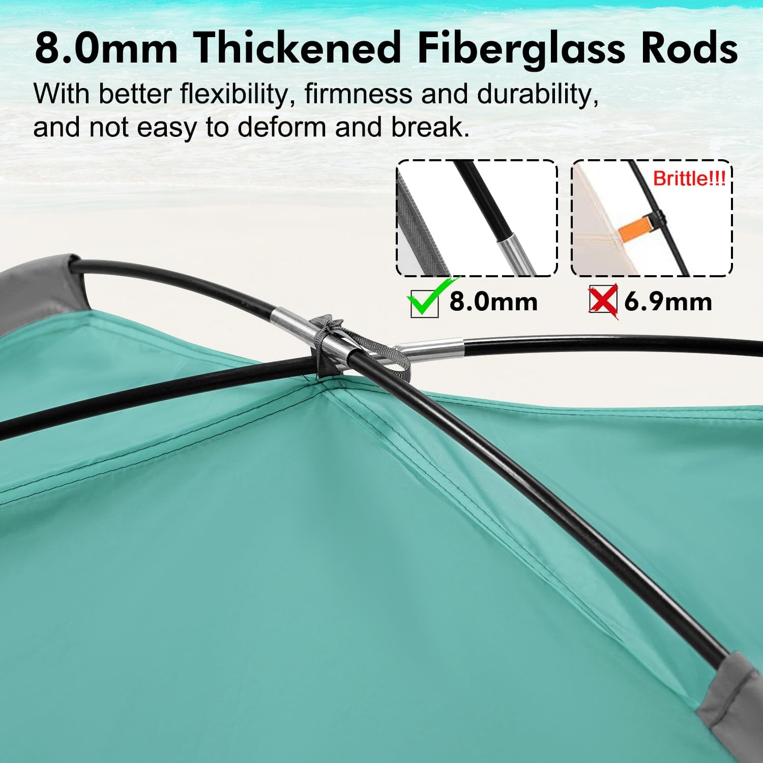 - 8.0mm Thickened Fiberglass Rods: We increased the thickness of the fiberglass rods to 8.0mm to make it more flexible, sturdy and durable. It can support the tent more stable and will keep shape even after long time use.