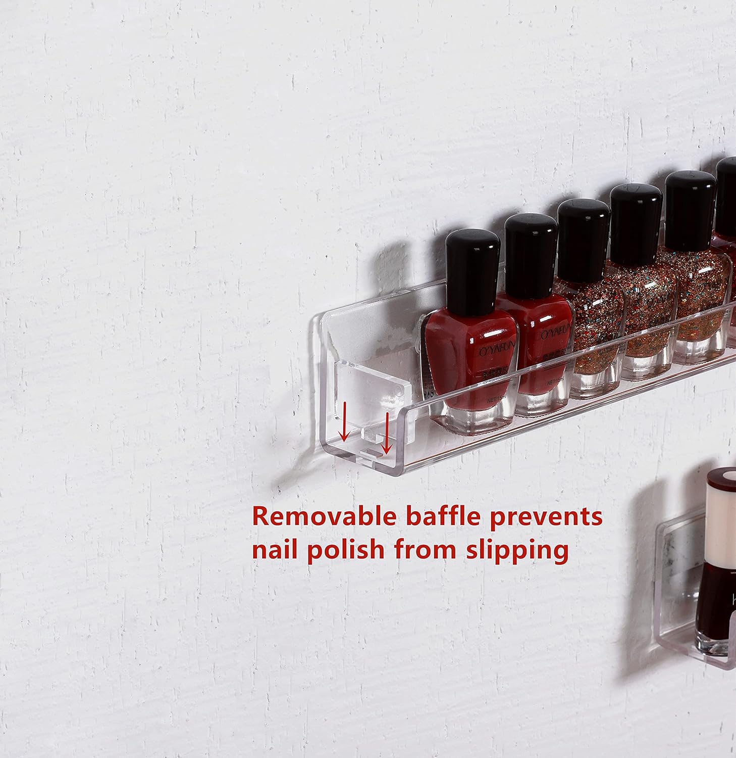 - ANTI FALLING BAFFLE:Designed with 2 removable stop inserts on the nail polish rack ends to keep bottles from falling out the sides of acrylic shelf