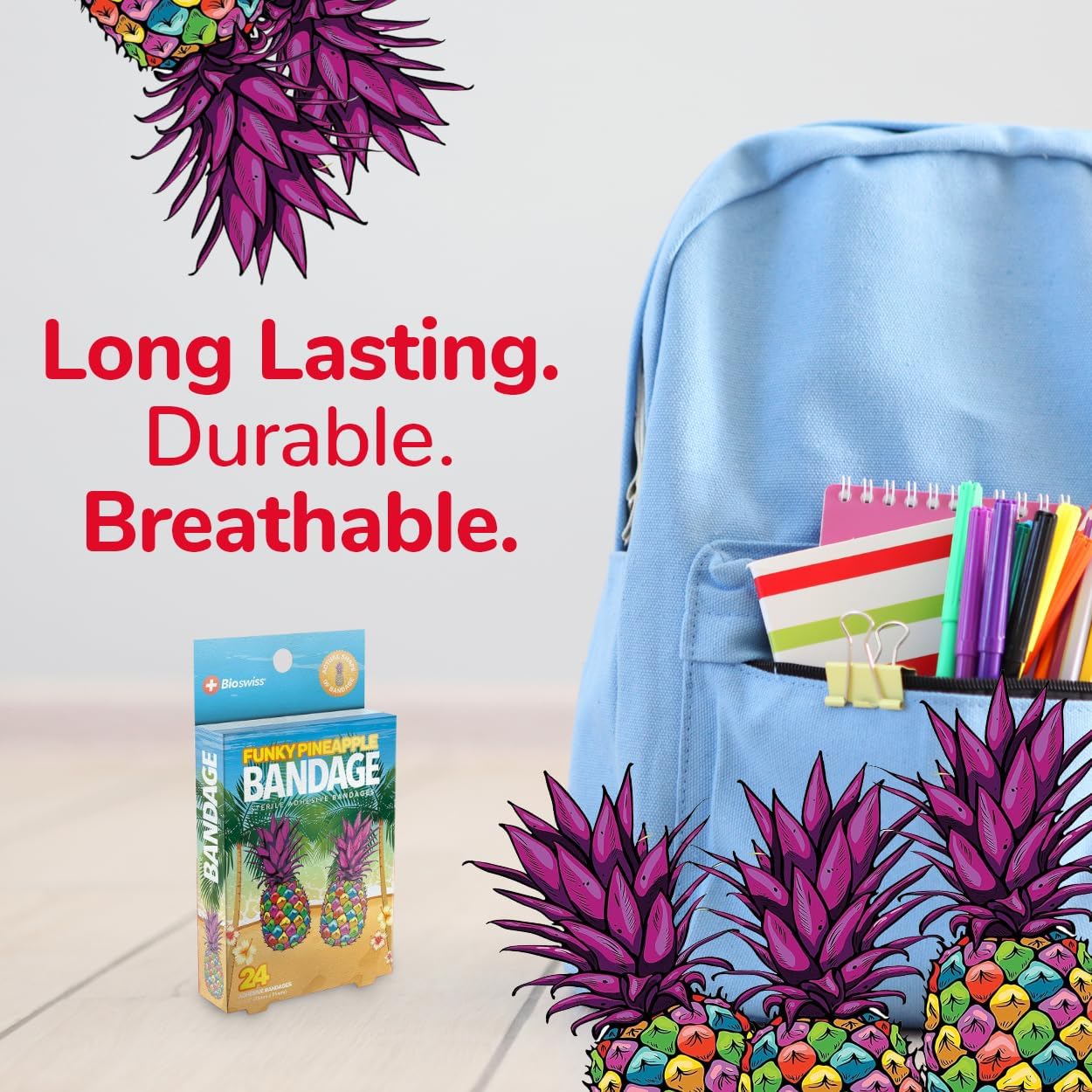 - FUNKY PINEAPPLE BANDAGES: This 24 piece pack of adorable and delicious looking tropical pineapple bandages is great for putting a smile on kids' faces while protecting wounds such as cuts, scrapes, and burns; sticky bandages are perfect for kids and adults alike, and also for school nurses and pediatric doctors