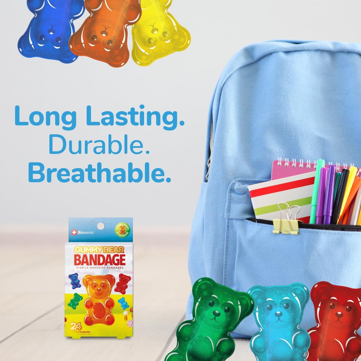 - GUMMY BEAR BANDAGES: This 24 piece pack of adorable and delicious looking gummy bear bandages is great for putting a smile on kids' faces while protecting wounds such as cuts, scrapes, and burns, and come in 3 assorted colors; sticky bandages are perfect for kids and adults alike, and also for school nurses and pediatric doctors