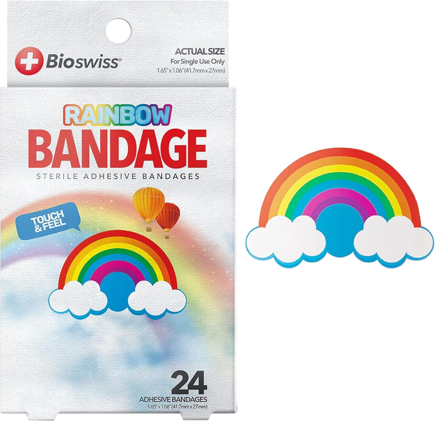 BioSwiss Bandages, Rainbow Shaped Self Adhesive Bandage, Latex Free Sterile Wound Care, Fun First Aid Kit Supplies for Kids, 24 Count