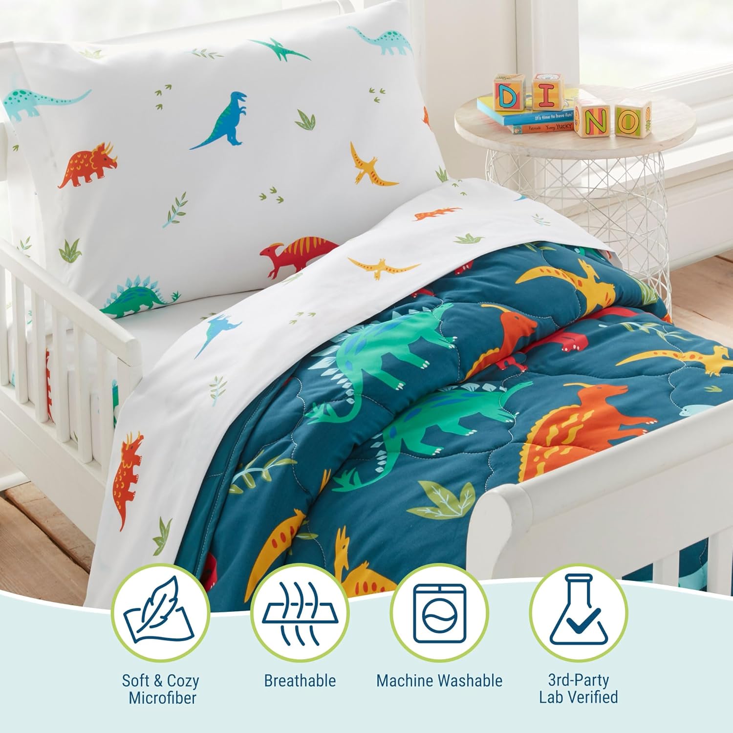 - 100% Super Soft Microfiber – toddler bedding sets are sized at 59 x 43 inches and feature a 100% Polyester microfiber exterior. Its lightweight material makes the bed set breathable enough whatever the climate may be!