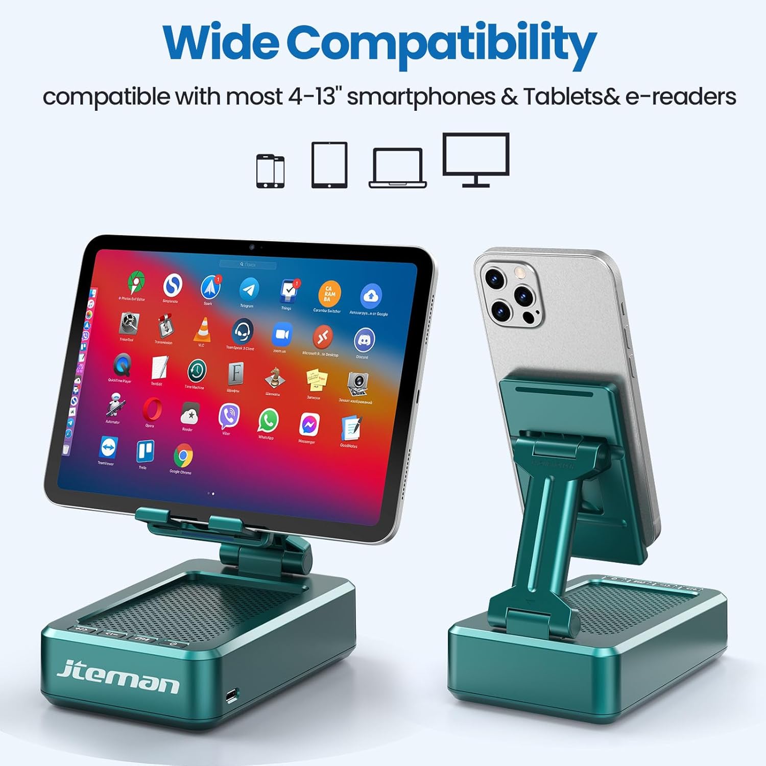 - Widely Compatible:Jteman bluetooth speaker with phone holder is suitable for most 4-13 inch smartphones,tablets and e-readers with bluetooth function.The hook fits devices up to 0.59 inches (15 mm) thick. NOTE:This product does not have a power bank function and cannot charge your phone.