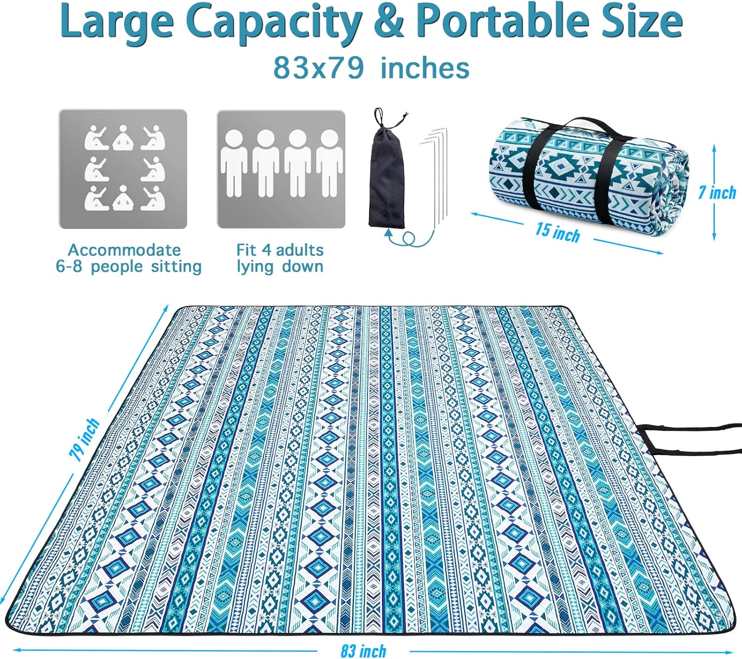 PY SUPER MODE Picnic Blankets Extra Large, Waterproof Foldable Outdoor Beach Blanket Oversized 83x79” Sandproof, 3-Layer Picnic Mat for Camping, Hiking, Travel, Park, Concerts(Teal Boho)