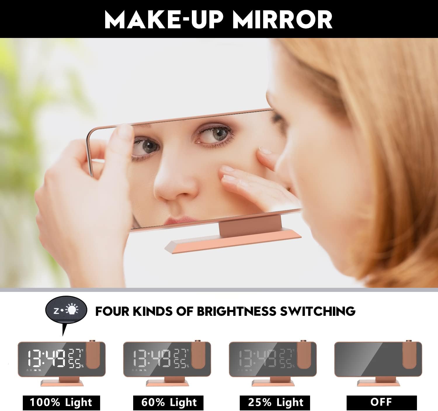 Projection Digital Alarm Clock for Bedrooms, Alarm Clock Radio on Ceiling, USB Charger Port, Temperature & Humidity Display, 7.3” Large Mirror LED Display,12/24H,Snooze,Dual Loud Clock- 4 Dimmer