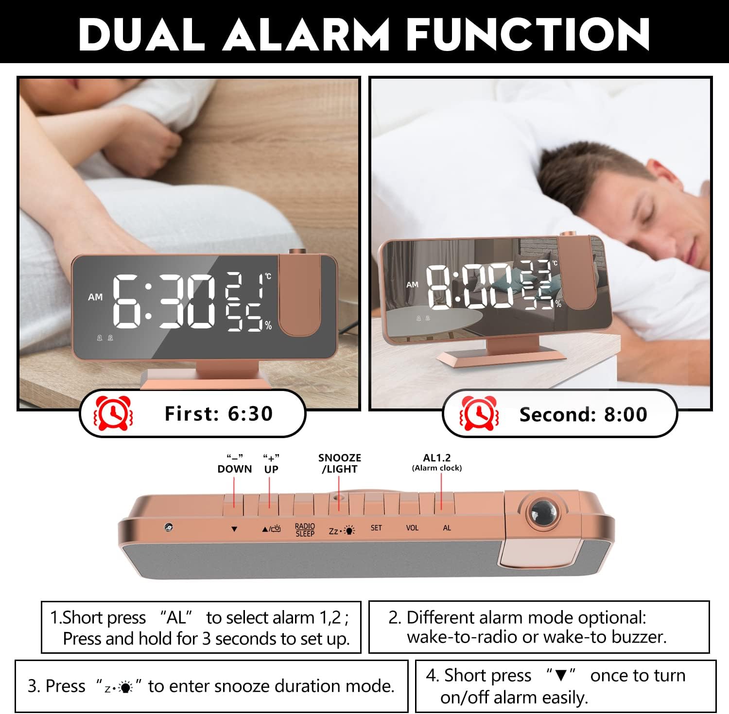 - 【180° Projection Alarm Clock】 Perfect alarm clock. This 180° rotatable clock with focus control ring projected a clear time on your wall. Whenever you wake up, the time comes into your eyes. And our clock equipped with a high sensitivity sensor which can adjust the display brightness, it will not disturb you or your kids sleeping.