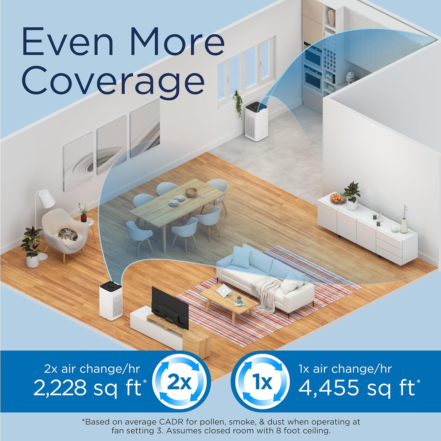 - MAXIMUM COVERAGE: Cleans large spaces up to 3,700 sq ft in one hour, 2,500 sq ft in 30 minutes (CADR 950). Ideal for homes, apartments, bedrooms, living rooms, offices, schools, universities, classrooms, hospitals, restaurants, and other businesses.