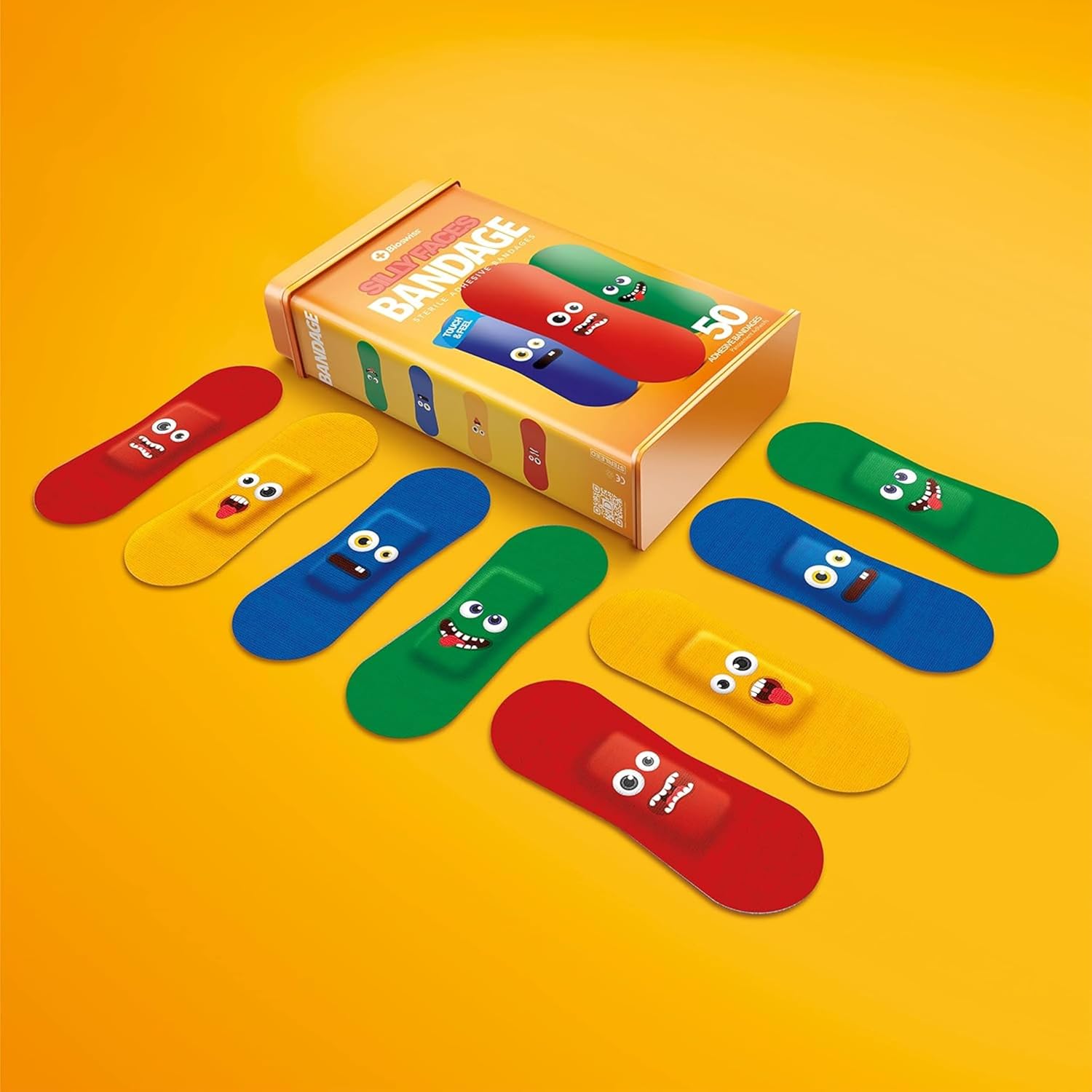 - SILLY FACES BANDAGES: This 50 piece tin of funny face bandages is great for putting a smile on kids' faces while protecting wounds such as cuts, scrapes, and burns, and come in 4 assorted styles; sticky bandages are perfect for kids and adults alike, and also for school nurses and pediatric doctors