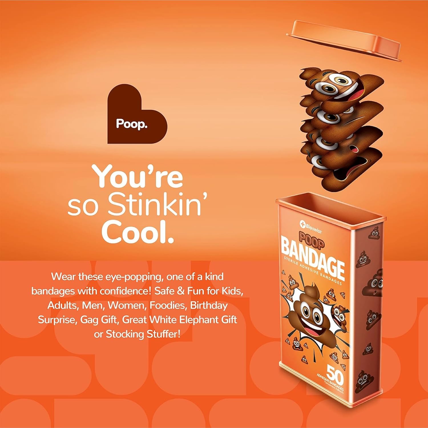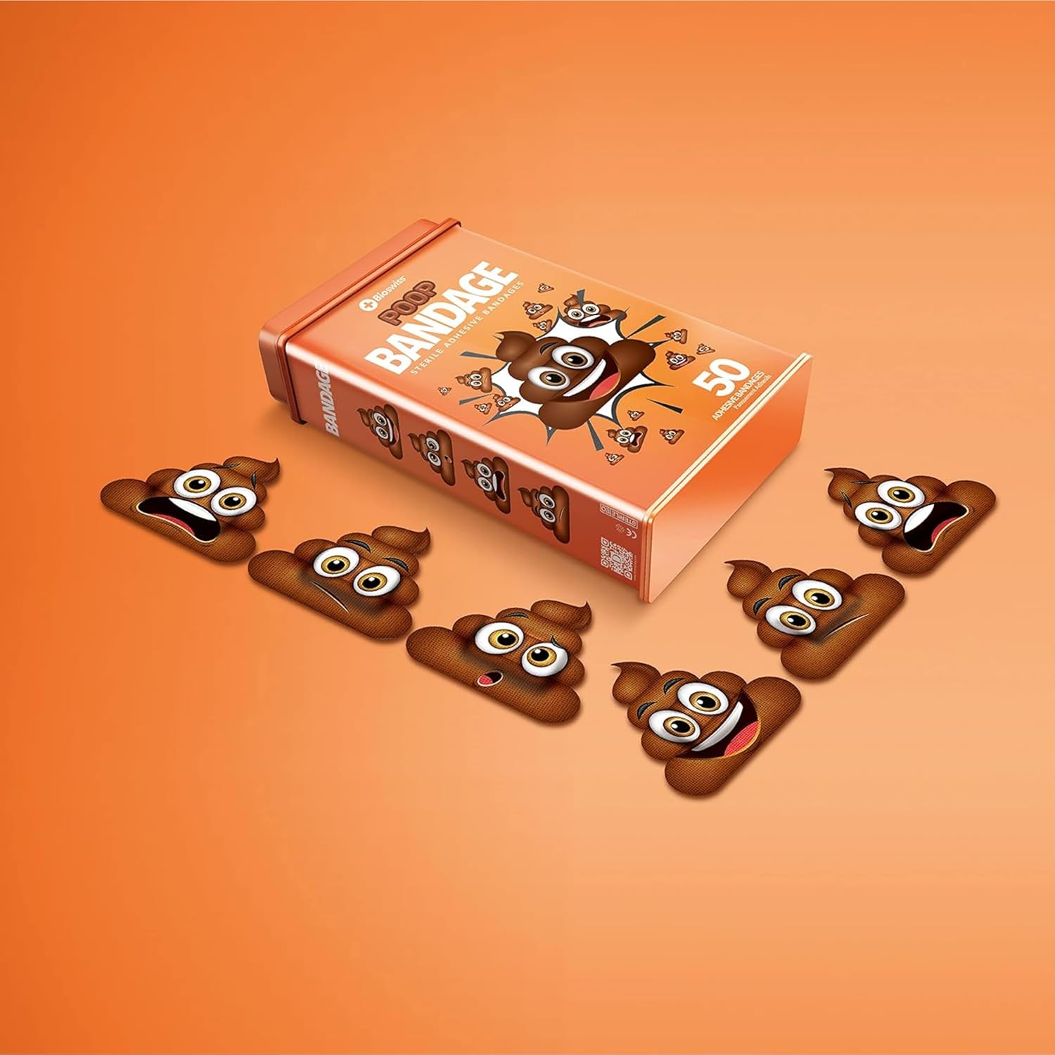 - POOP BANDAGES: This 50 piece tin of funny poo bandages is great for putting a smile on kids' faces while protecting wounds such as cuts, scrapes, and burns, and come in 4 assorted styles; sticky bandages are perfect for kids and adults alike, and also for school nurses and pediatric doctors